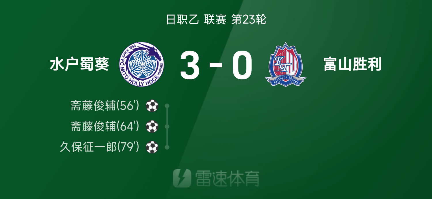 07月12日讯 25赛季日职乙联赛第23轮,水户蜀葵3-0战胜富山胜利。上半场比赛,两队互交白卷。下半场比赛,斋藤俊辅梅开二度,随后久保征一郎半场吊射破门,将比分定格在了3-0。