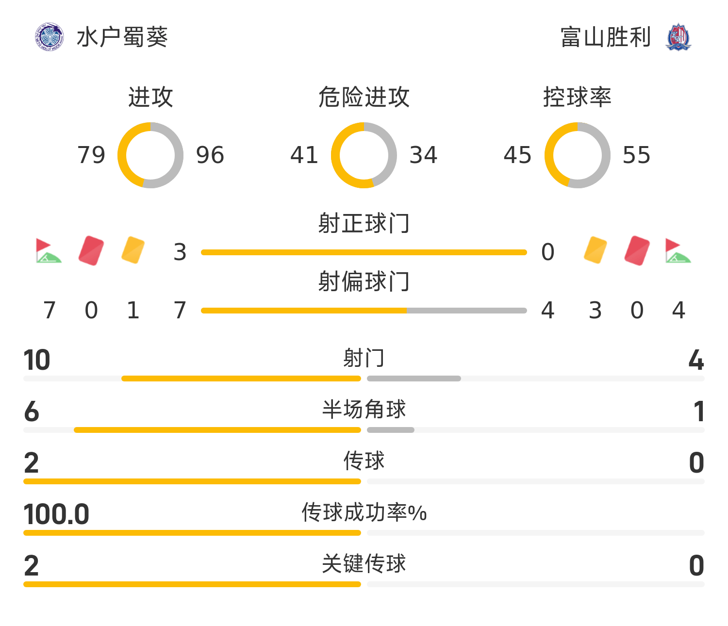 富山胜利首发阵容:1-田川智树、5-今濑淳也、88-滨托巳、4-神山京右(60’19-实藤友纪)、23-西屋新平(46’20-武蔵大山)、18-伊藤匠、16-末木宽也(68’25-龟田步梦)、6-濑良俊太、33-高桥馨希、10-松田力(46’17-井上直辉)、39-古川正人(68’14-浦十藏)